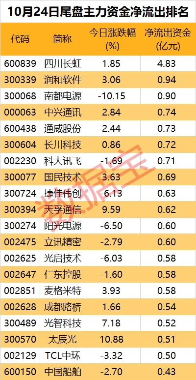 從尾盤主力資金凈流出來看,主力繼續拋售四川長虹,凈流出額高達4.83億元。