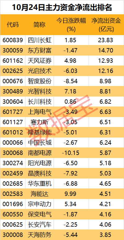 此前漲幅巨大的東方財富、天風證券等熱門非銀金融股,也遭到主力資金大幅凈流出;此外,今日部分電力設備個股,尤其是光伏設備相關的多只個股上榜,陽光電源、隆基綠能、晶澳科技主力資金凈流出均在5億元以上。