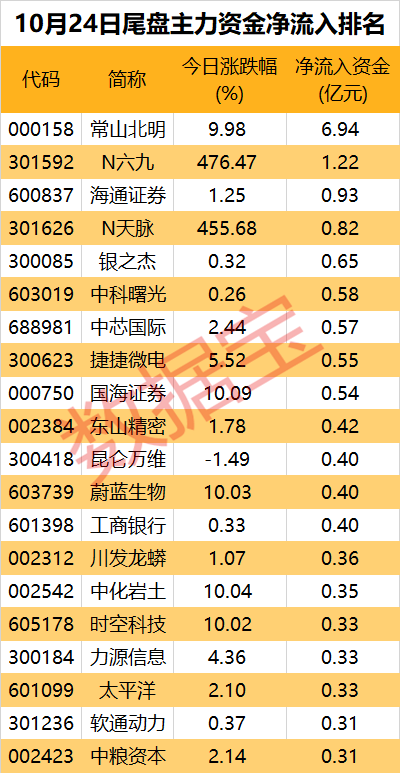 個股方面,常山北明、N六九尾盤主力資金凈流入超1億元,依次為6.94億元、1.22億元。海通證券、N天脈、銀之杰、中科曙光等多股凈流入金額超過5000萬元。