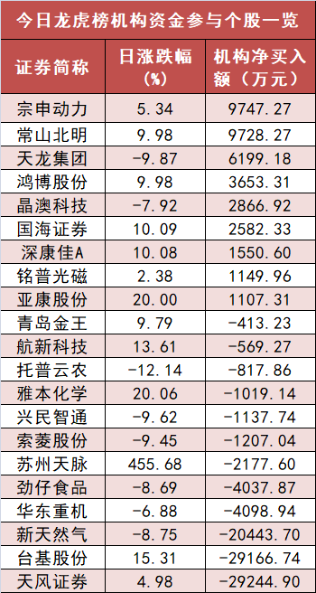 盤后龍虎榜數據顯示,機構現身多股,其中宗申動力等股票呈現機構資金凈買入,天風證券等股票呈現機構資金凈賣出。