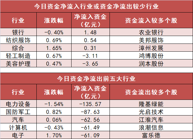 申萬一級行業中,電力設備、國防軍工、汽車、計算機等行業資金凈流出規模居前,其中電力設備行業凈流出135.57億元居首。