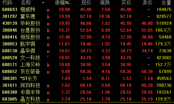 半導體板塊盤中再度走強,截至收盤,鍇威特、富樂德20%漲停,臺基股份漲超15%再創新高,文一科技、上海貝嶺等均漲停。