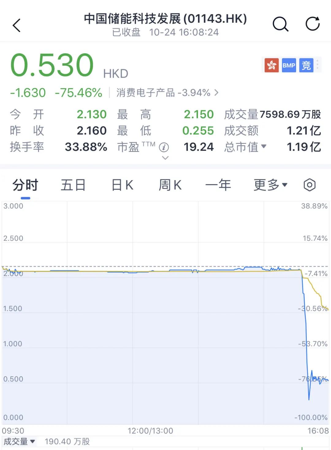 值得注意的是,港股中國儲能科技發展尾盤突然“閃崩”,一度跌近90%。截至收盤,該股仍跌75.46%,報0.53港元/股。