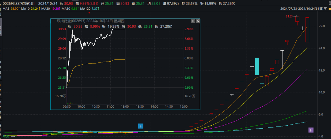 異動個股方面,雙成藥業今日早盤走出“地天板”,截至午間收盤,報30.93元/股,換手率23.67%。