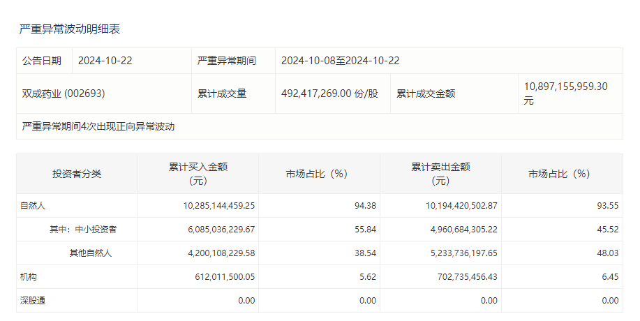 深交所10月22日發布的數據顯示,10月8日至10月22日期間,自然人對該股的交易占比在90%以上。